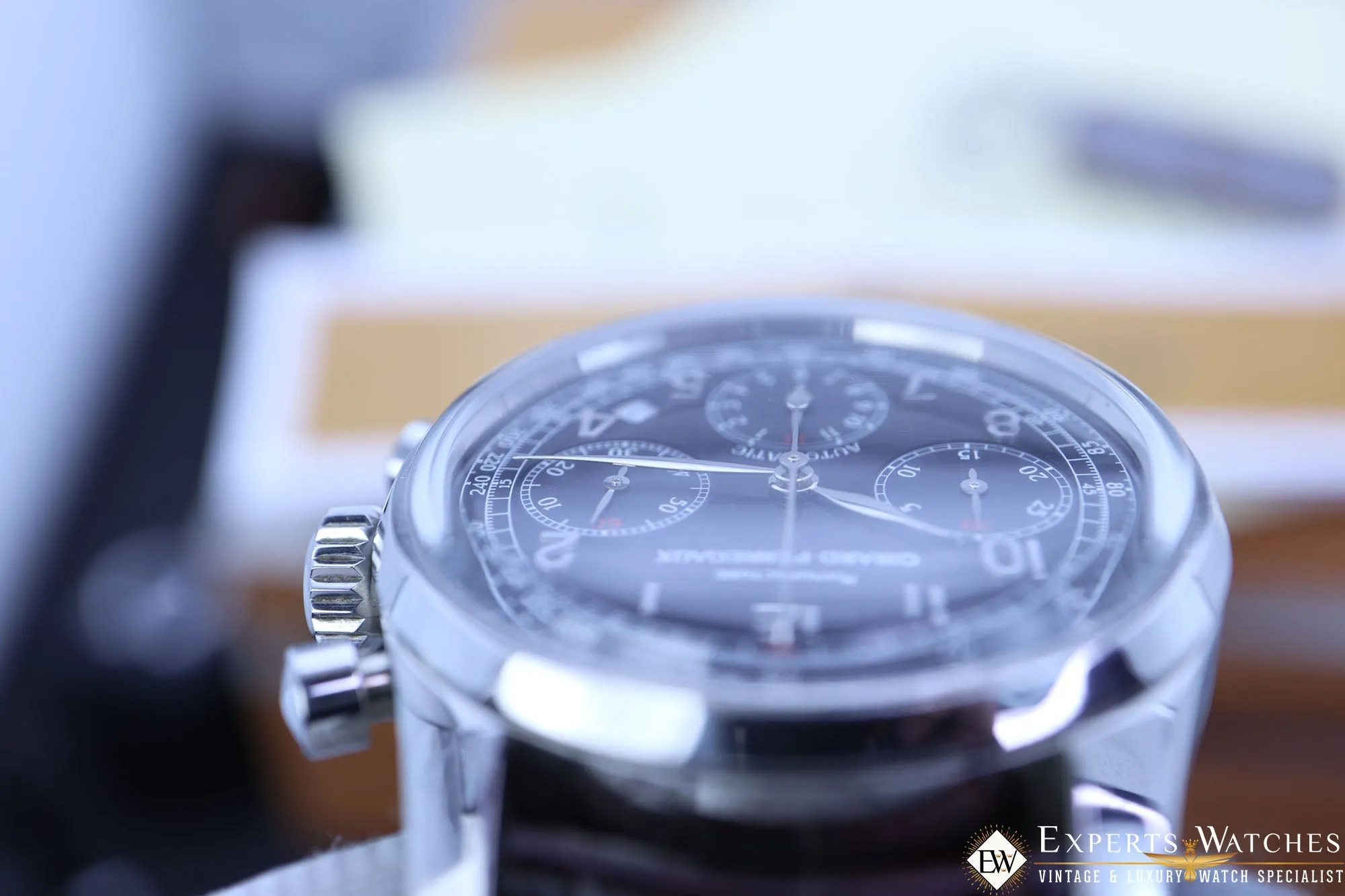 In myopinion, it is among the best-looking chronographs ever offered by any brand,period. Its proportions and overall size are ideal, and the dial is so greatlooking. The “fit and finish” on a Girard Perregaux is the best, tied with onlyA. Lange & Sohne. The watch was offered with a cream color dial or thisblack dial, which is much rarer. In all, GP made around 500 of the 1999chronographs. This is number 4XX. (this is per information provided viathe web)